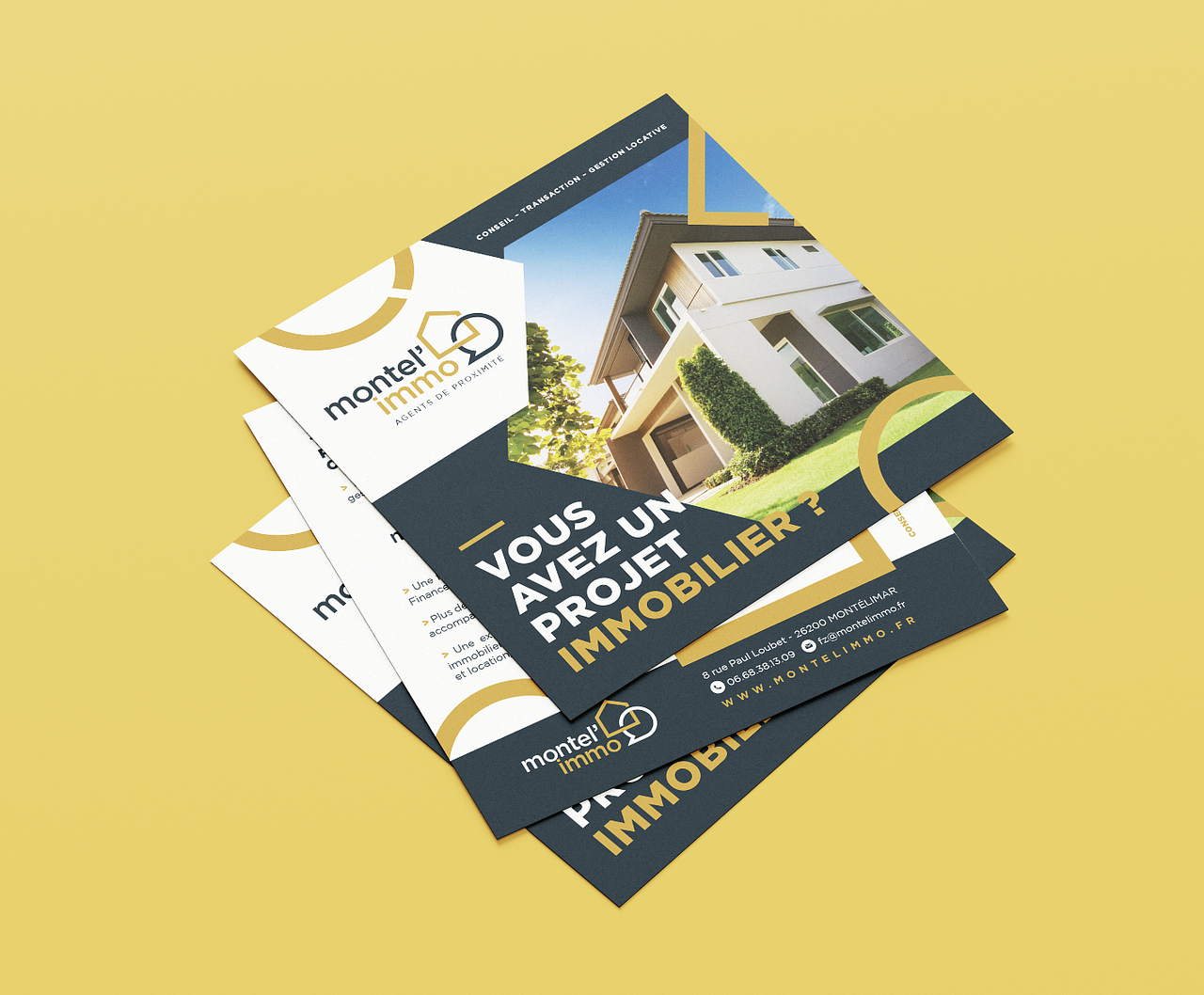 Montel'immo a sollicité un rebranding pour moderniser son image et refléter son professionnalisme. L'objectif a été de créer une nouvelle identité visuelle qui incarne la pertinence de l'agence dans l'ère moderne, tout en mettant en avant son engagement envers ses clients avec un design élégant et professionnel. Le client souhaitez par dessus tout des tonalités de couleurs en harmonie avec la charte de l’époque, le bleu et le doré.