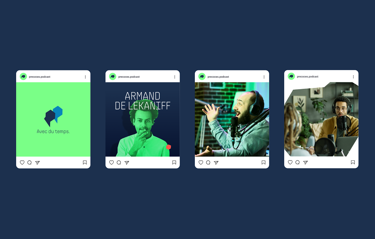 Déclinaisons à destination des réseaux sociaux pour l'identité visuelle du podcast business "Précoces"