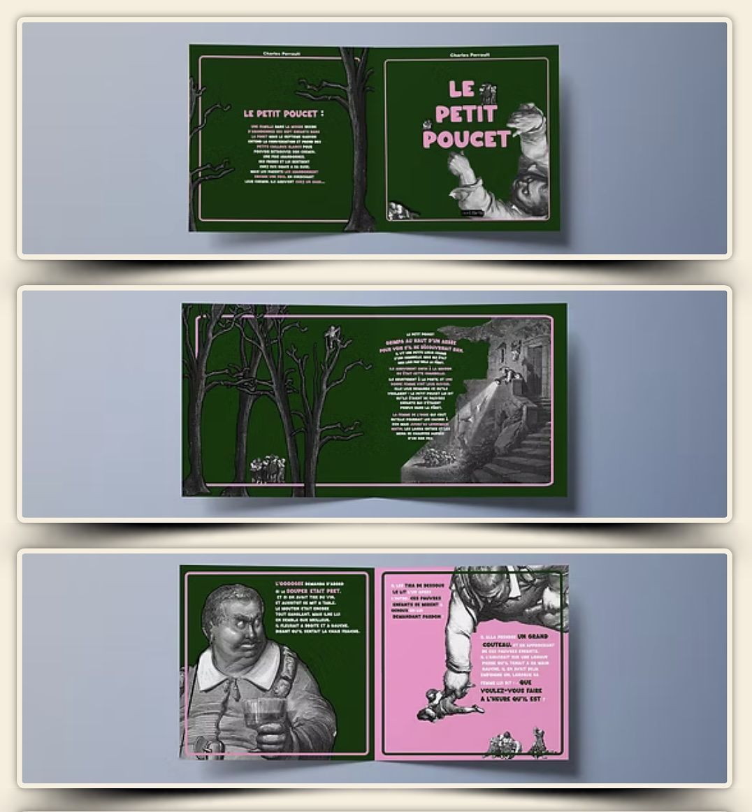 Conception d'une couverture et de la mise en page d’un livre pour enfant (un conte de Charles Perrault) Le petit poucet.