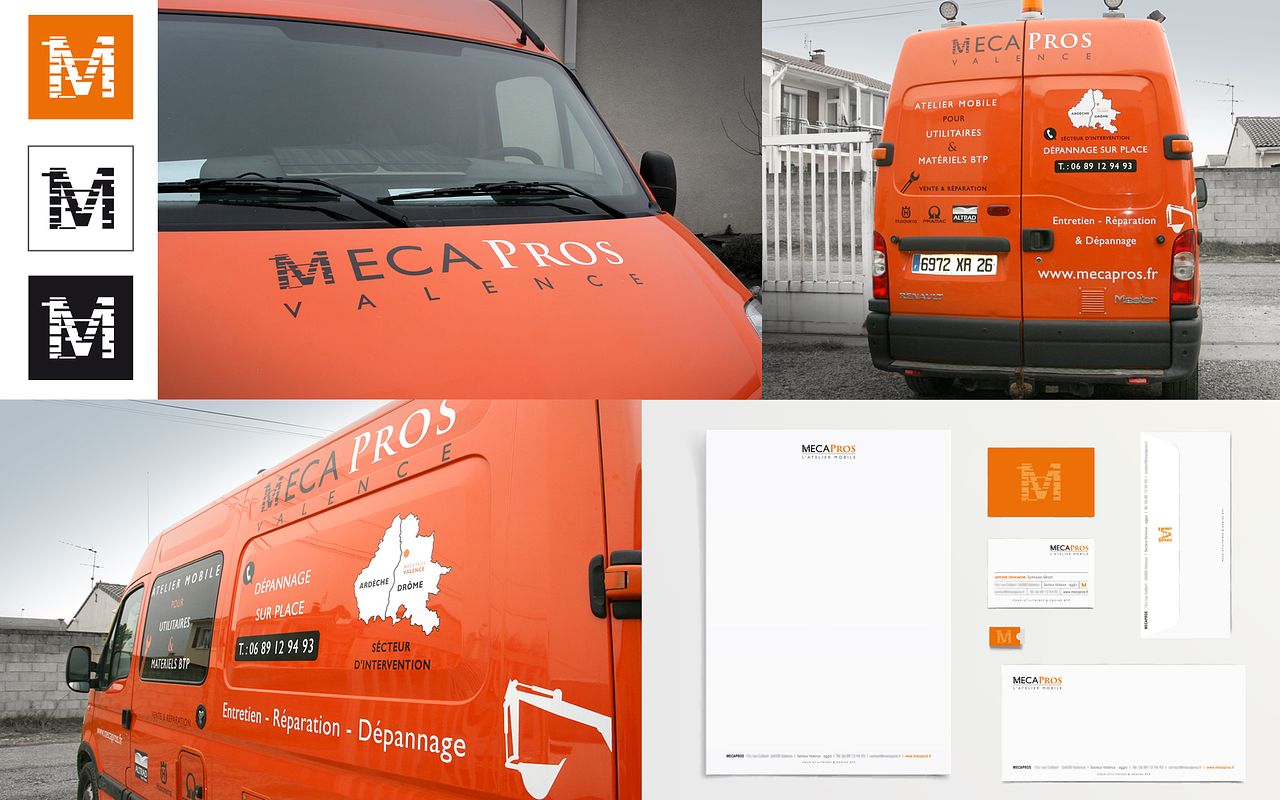 Réalisation : Logotype – Charte graphique – Papeterie – Carte de visite – Habillage véhicule // Concept : Logo sobre, épuré. Joue dr sur la symbolique plutôt que’utiliser l’image classique du secteur (camionnette). Jouer sur le « M » de Mécapro et le « M » de Mobilité pour exprimer la vitesse de réalisation et la mobilité de l’atelier.