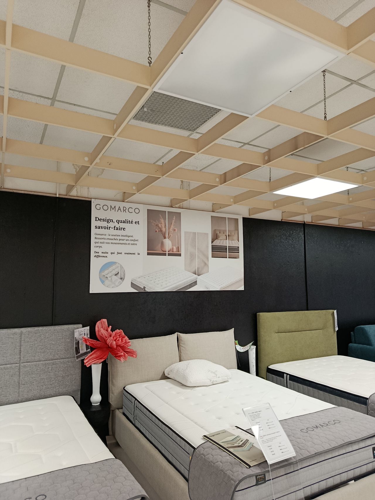 Publicité sur Lieux de Vente pour un magasin d'ameublement, en particulier pour le rayon literie avec une affiche (3mX1m) pour toutes les marques vendues par cette enseigne.